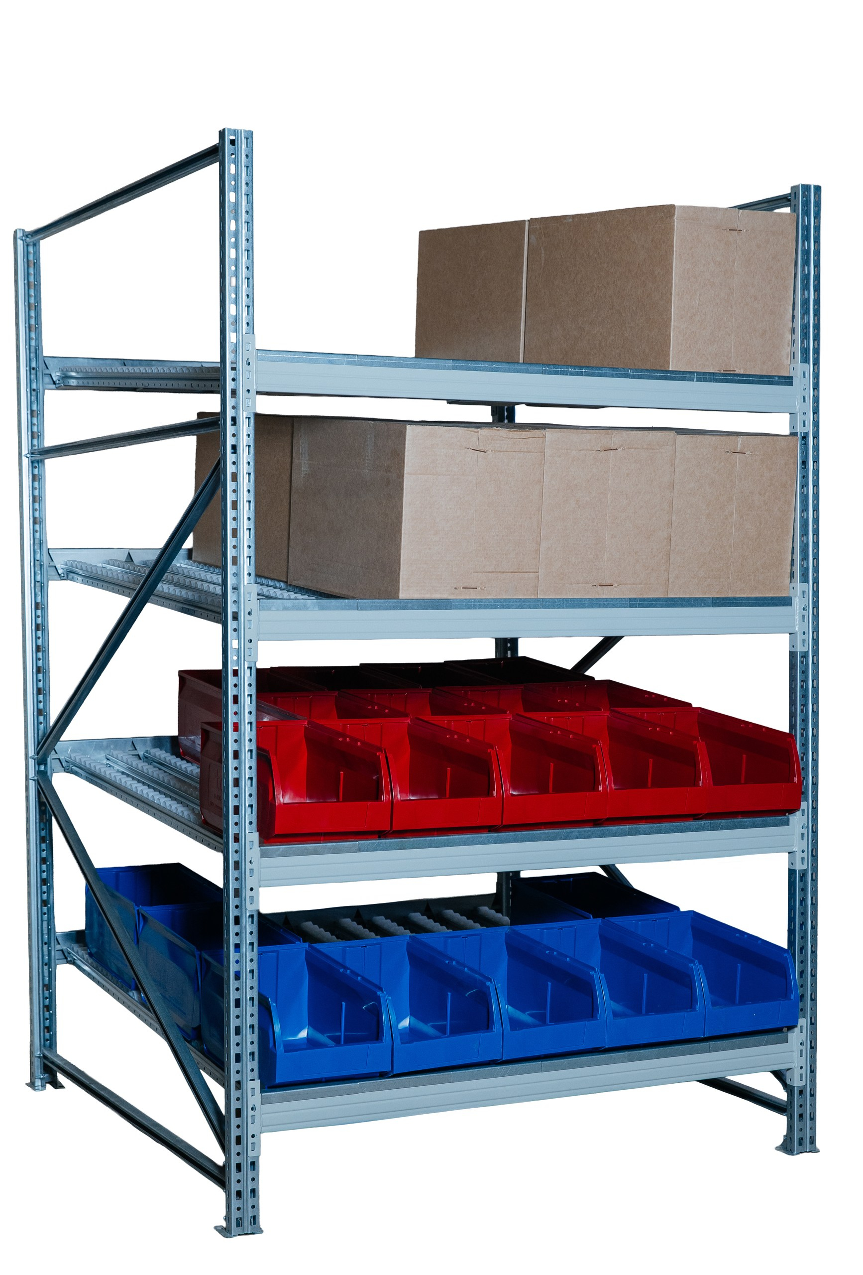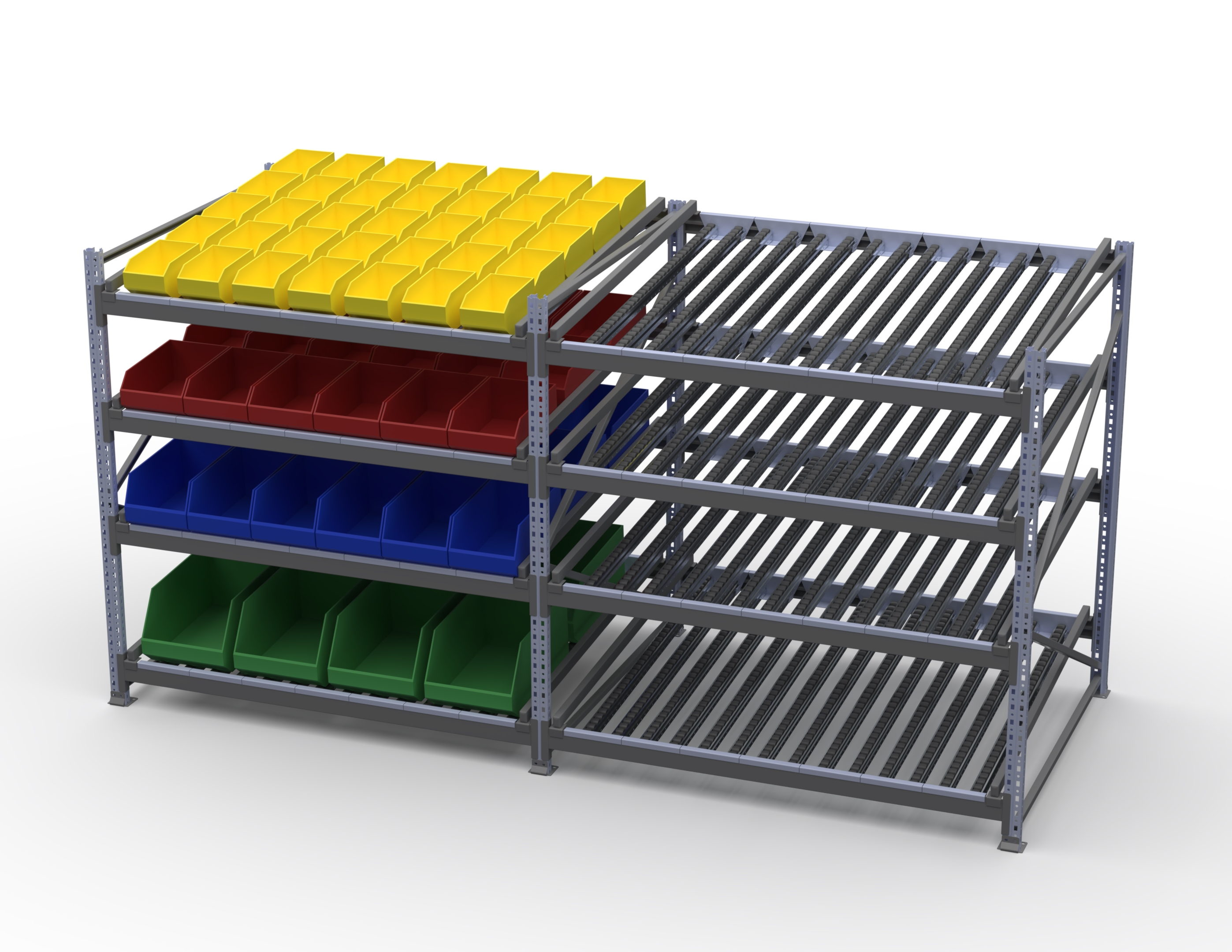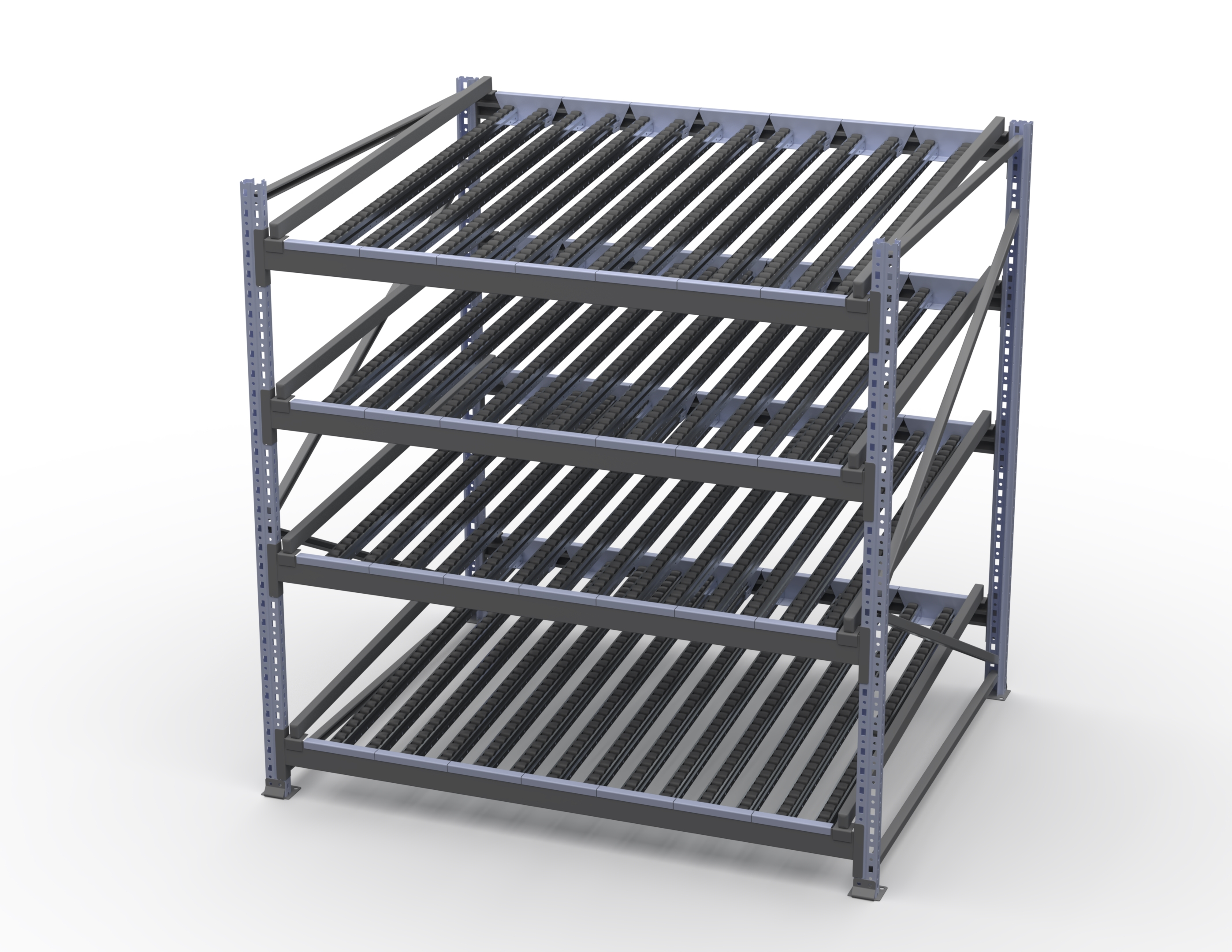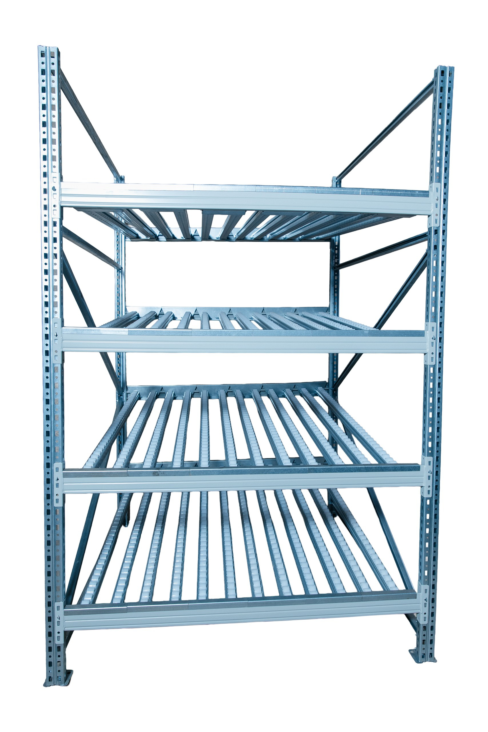 Гравитационный стеллаж с роликовыми полками 1600х1500х1300, 4 яруса