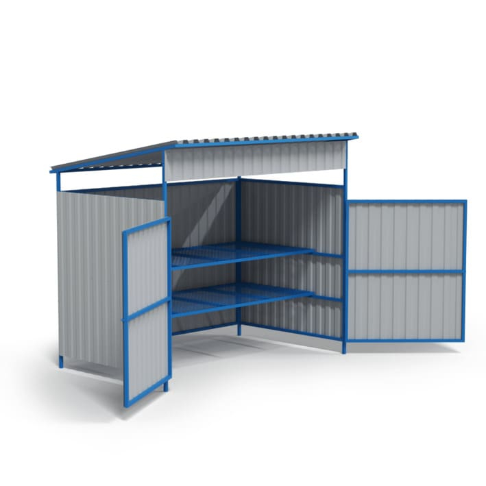 Конструкция выполнена из профильной трубы и профнастила, что обеспечивает надёжную защиту содержимого. Рекомендуется устанавливать площадку на ровное бетонное основание для обеспечения устойчивости и долговечности эксплуатации. Благодаря разборной конструкции возможна удобная транспортировка и сборка на месте установки.